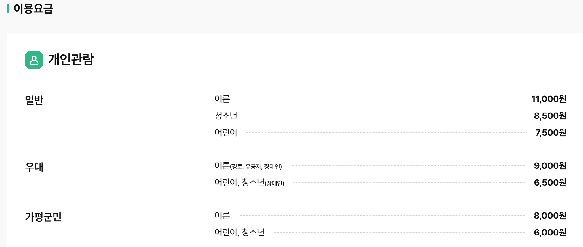 | 가평군민 (성인/청소년) | 8,000원 / 6,000원 |