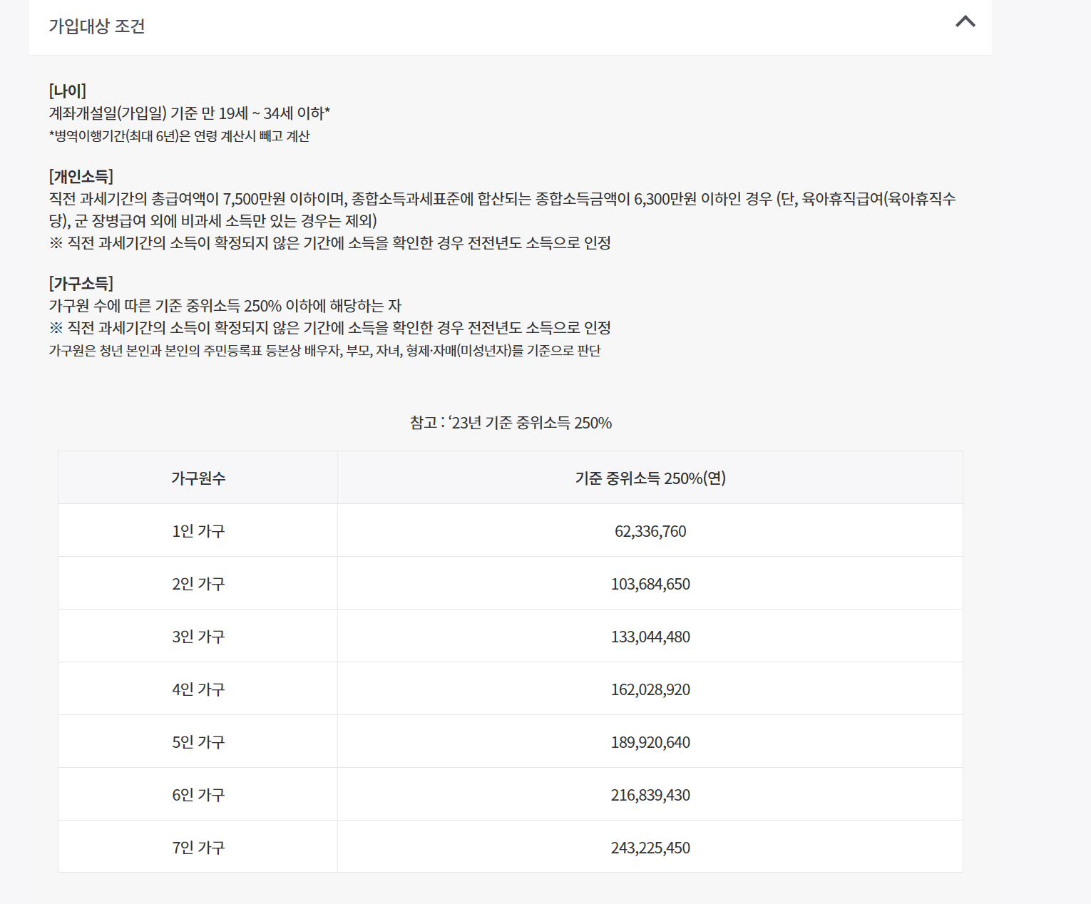- 나이, 소득, 가구요건 중 하나라도 기준 초과 시 가입 불가